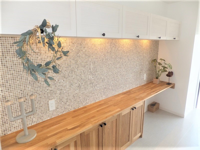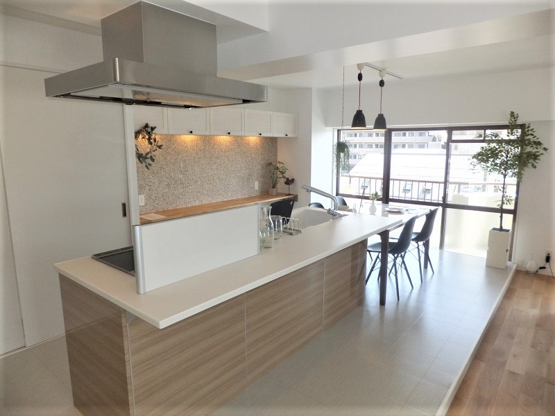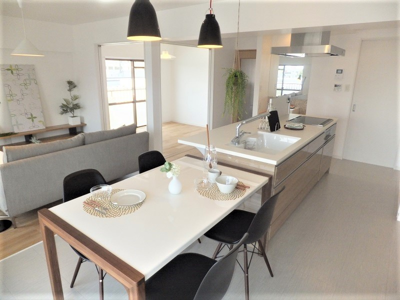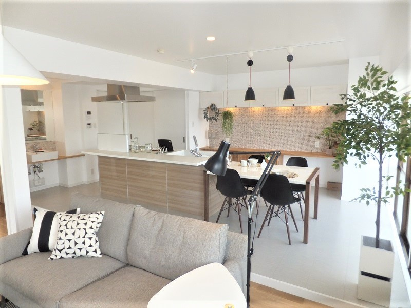 ホワイト×ベージュカラーで柔らかい雰囲気のお部屋にコーディネート。キッチン背面にはベージュカラーのタイルをパネリングし、お部屋のアクセントに。リビングに隣接した洋室の扉を開ければ、広々とした開放感のある空間に。アイランドキッチンに立ちながらお部屋全体が見渡せる様に設計しました。