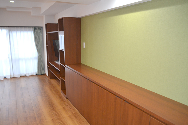 テレビサイズに合わせて造作したテレビボードは収納力も抜群。すっきりと大容量収納出来る様にテレビボード脇には扉付きのサイドボードを設置しました。
