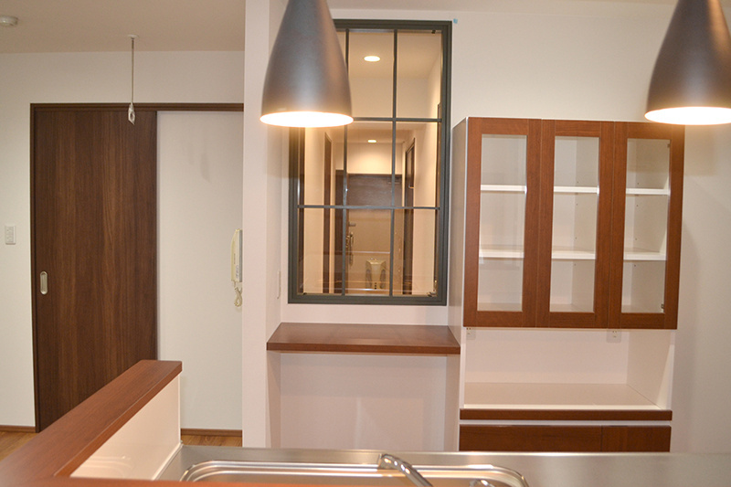 毎日のお料理も楽しくなるカフェ風の対面キッチン。廊下とキッチンの間に作ったガラス窓がデザインのポイントです。対面キッチン裏のスペースには本や、お気に入りの小物を飾れるニッチスペースを設置しました。