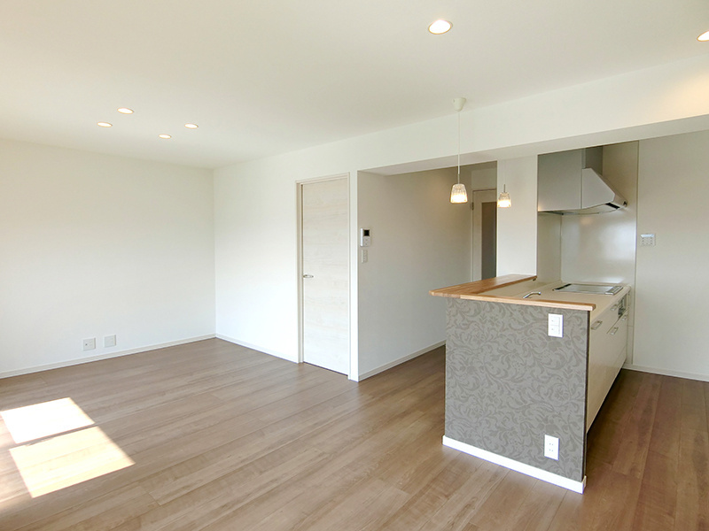 光がほとんど入らなかったキッチンは、採光が十分に取れる対面キッチンを設置したリビングダイニングへと変更。