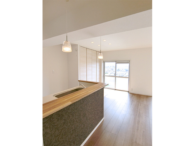 キッチン周りのクロスは幾何学的でシックなアクセントクロスを貼り、ガラス製のペンダントライトを付け、大人ラグジュアリーな雰囲気に仕上げました。
