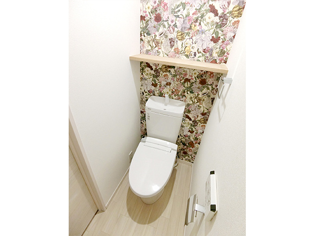 トイレには花柄のアクセントクロスを貼り、大人可愛い空間へとコーディネート。