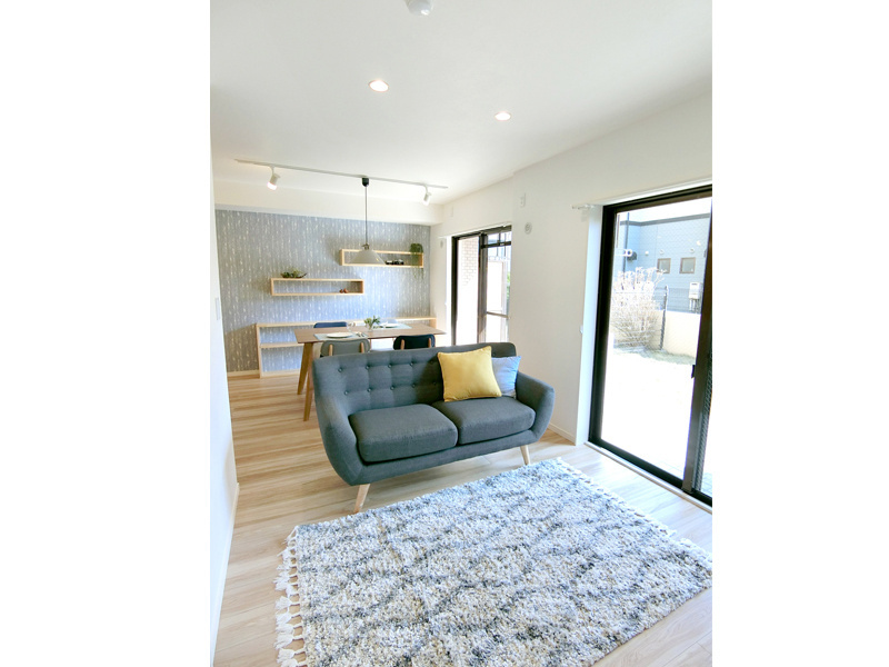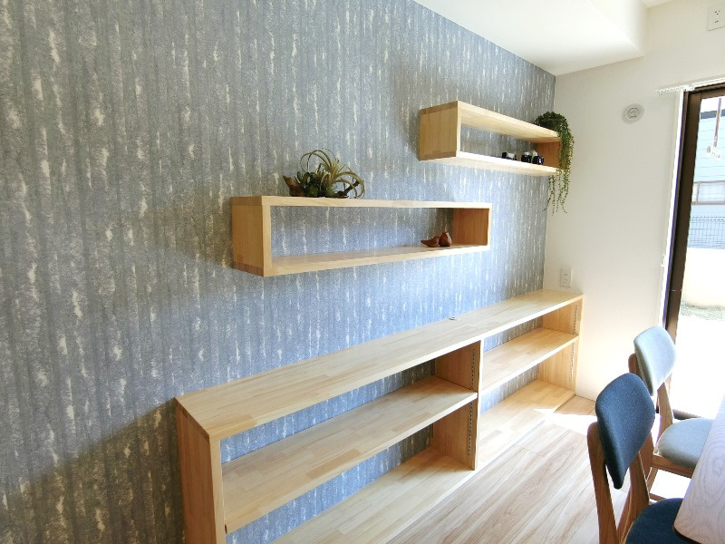 LDKの一面にアクセントクロスを採用し、キャットウォーク兼オープンシェルフを設置。