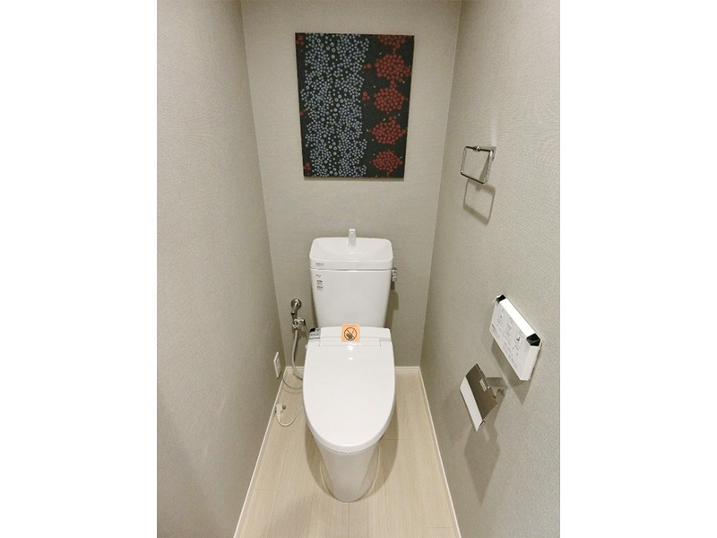 トイレはグレーの壁紙とファブリックパネルで落ち着いた印象に仕上げました。