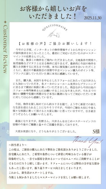 このたびは素敵なリノベーション物件を紹介いただき、ありがとうございました。