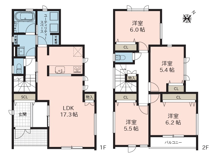 1階:LDK17.3 ユーティリティ 2階:洋6.2 洋6.0 洋5.5 洋5.4 |