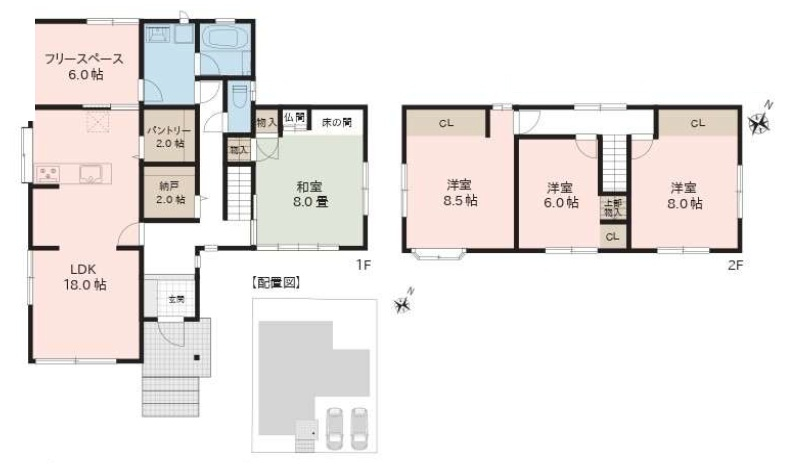 1階:LDK18 和8 フリースペース6 納戸 パントリー 2階:洋8.5 洋8 洋6 |