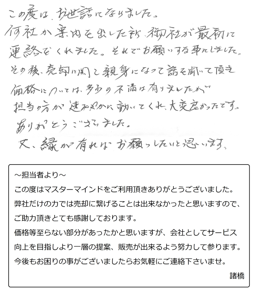 その後、売却に関し親身になって話を聞いて頂き、価格については、多少の不満はありましたが担当の方が速みやかに動いてくれ、大変良かったです。ありがとうございました。